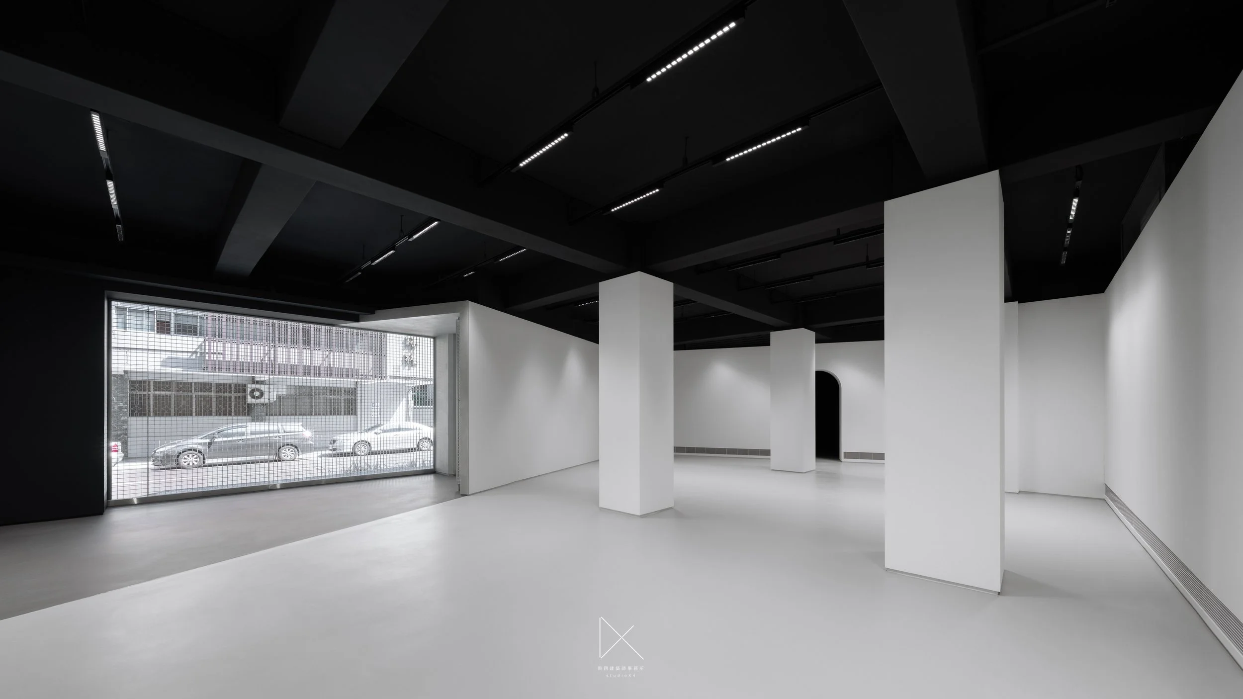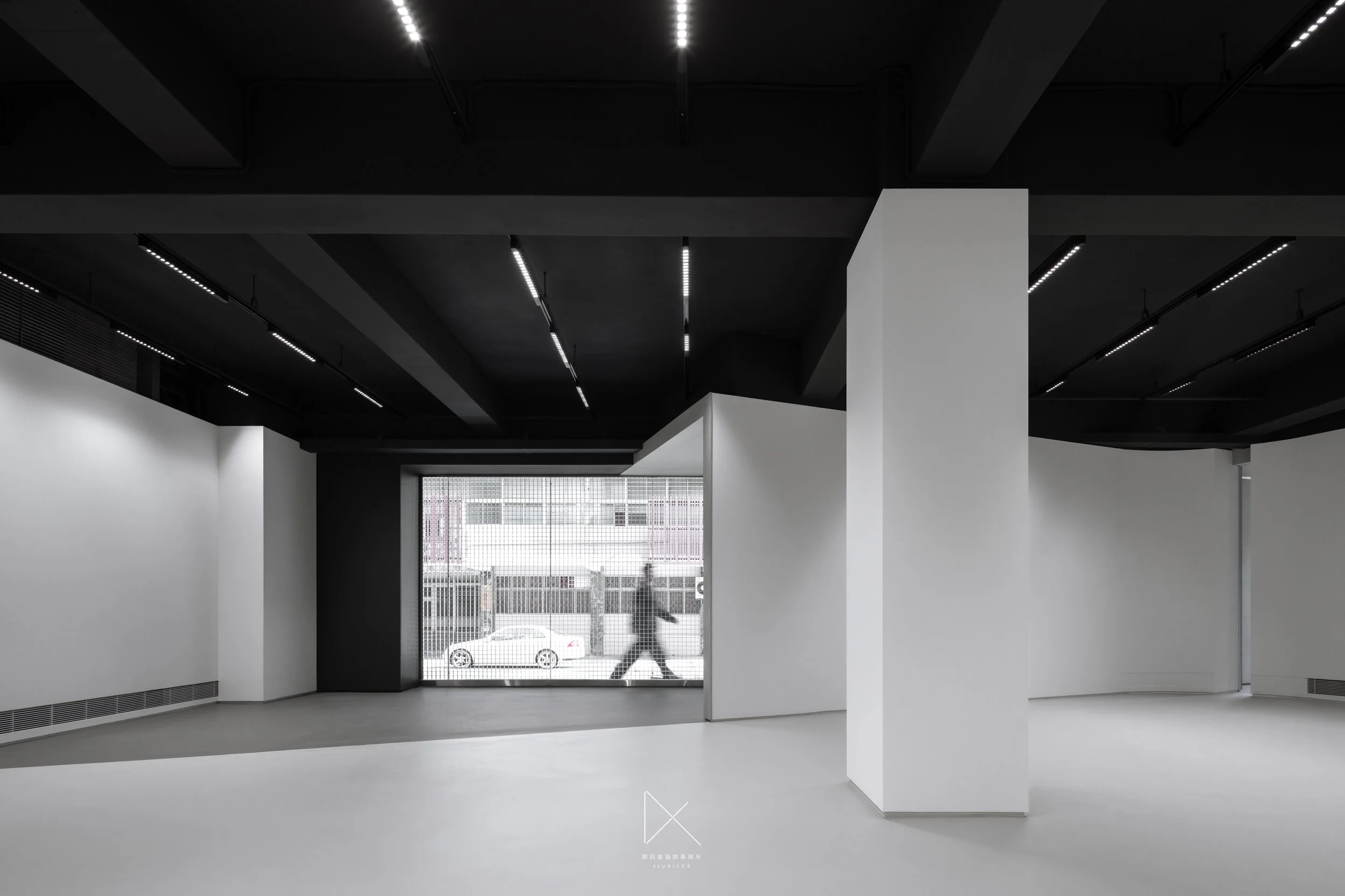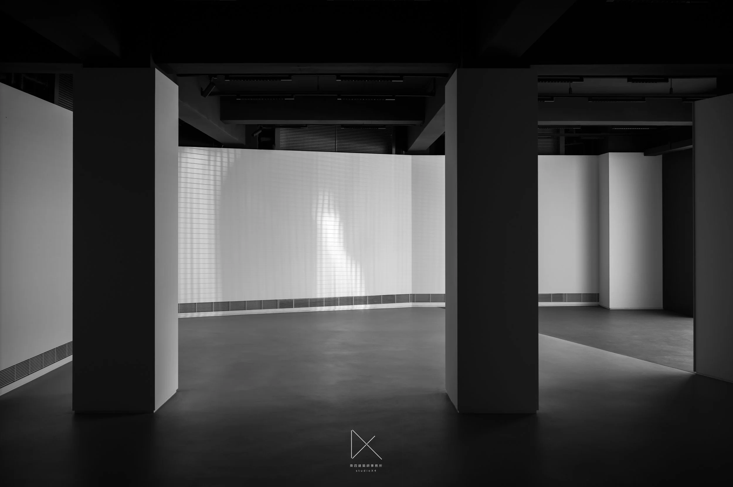 主展間空景,四根方柱排列,鋁格光幕投影於後牆,黑白。