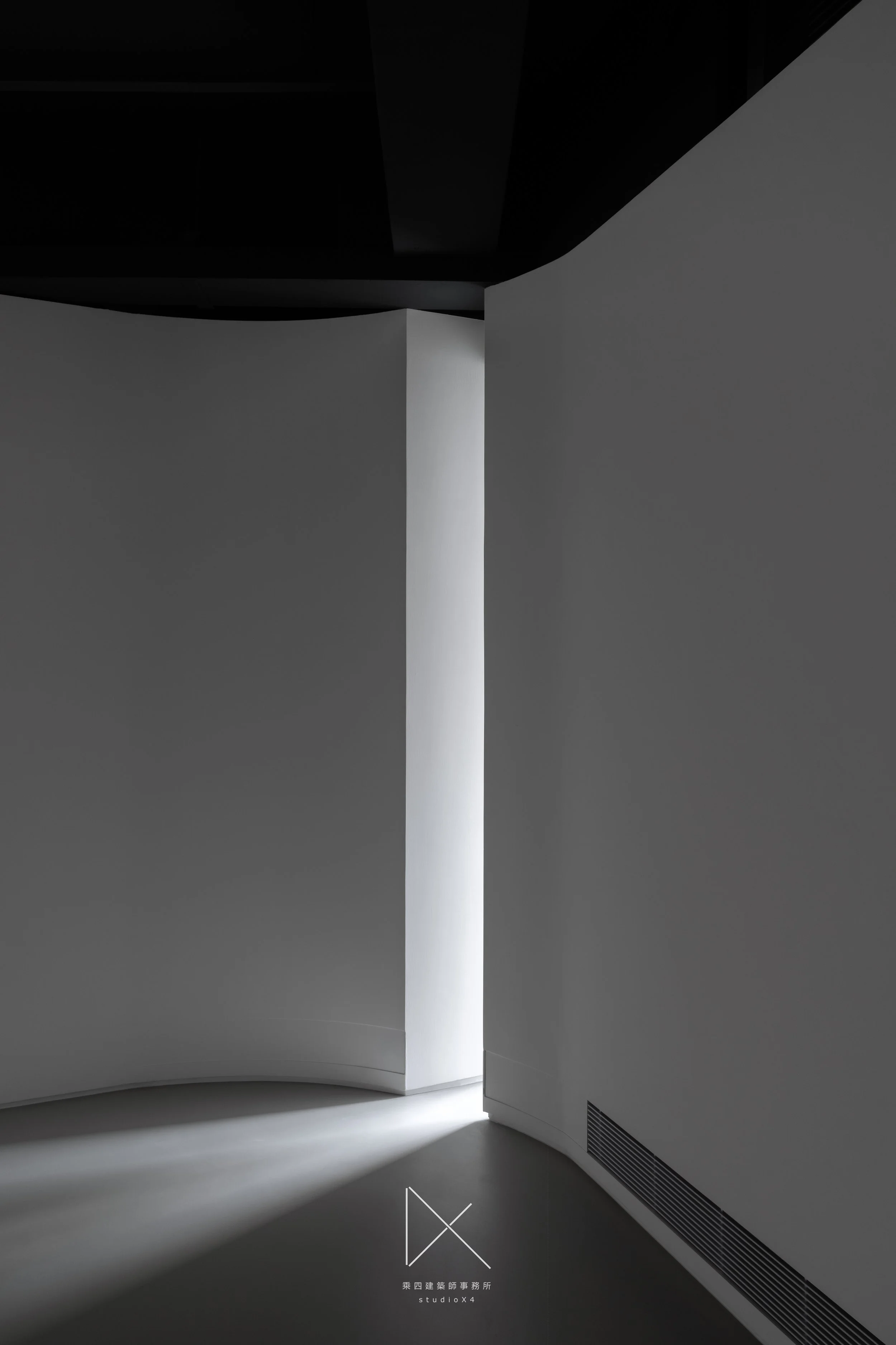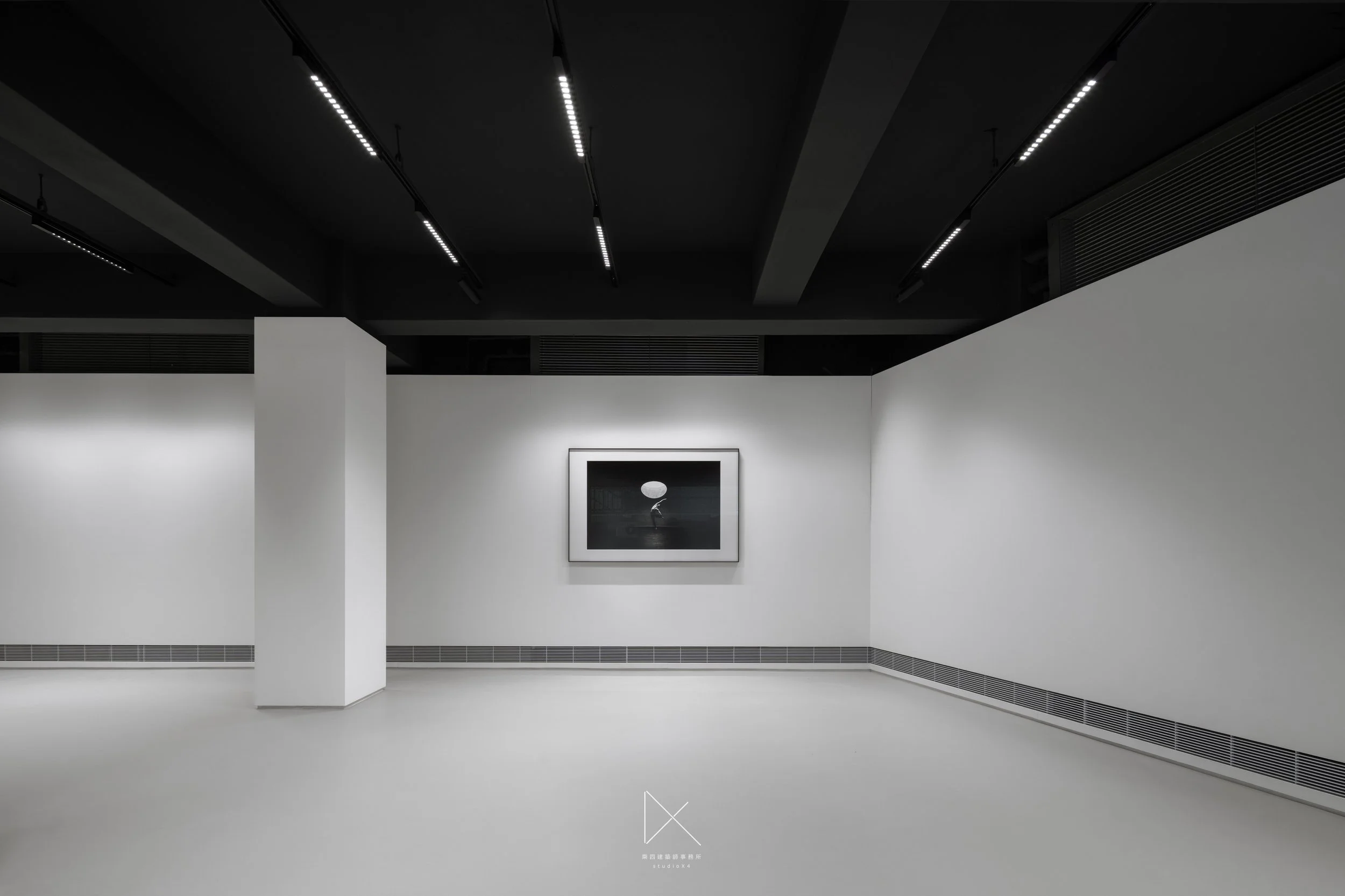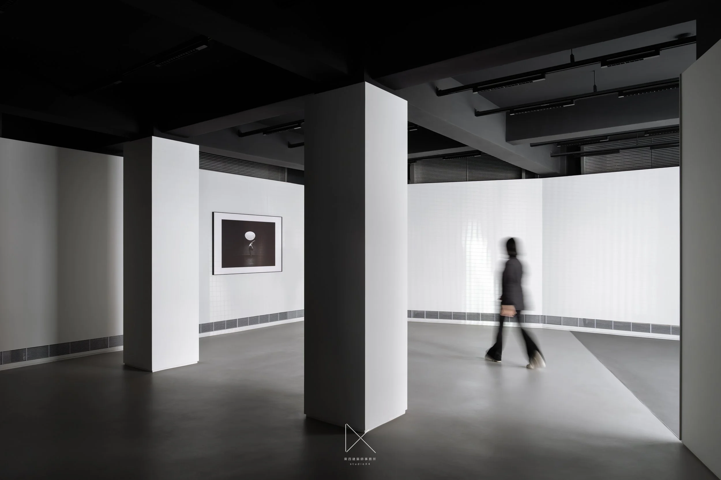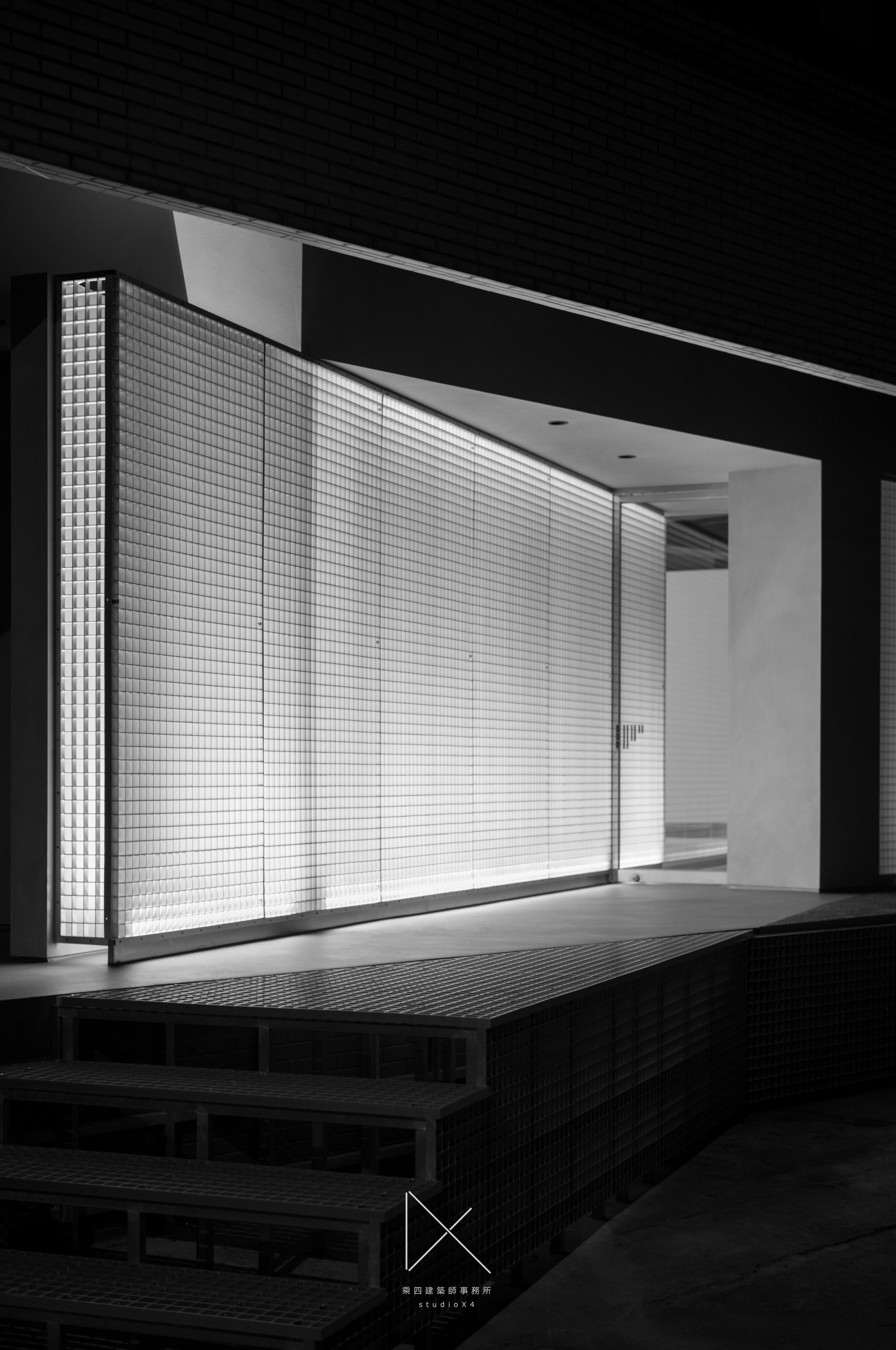 主展間空景,四根方柱排列,鋁格光幕投影於後牆,黑白。