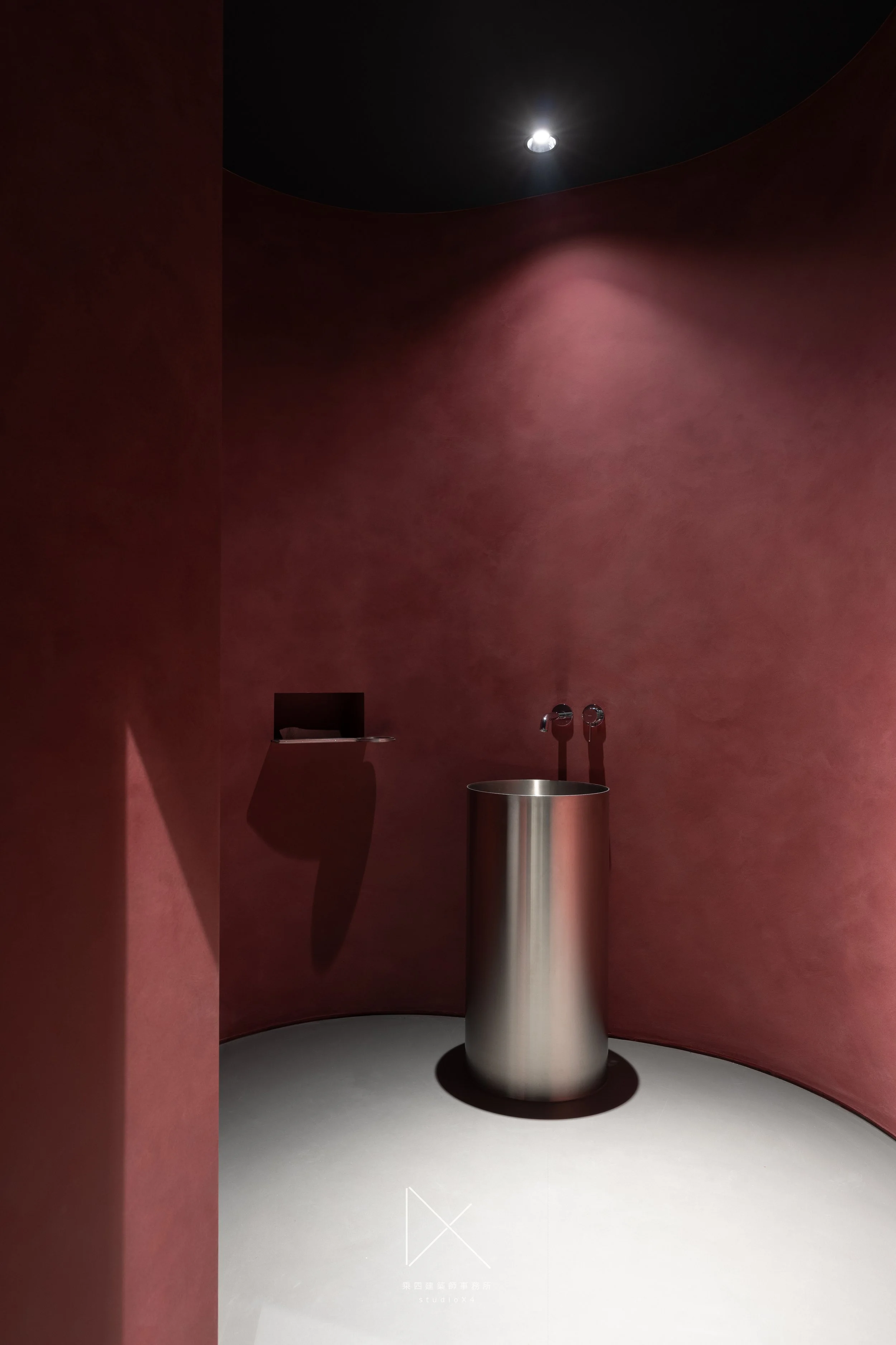 洗手間,深紅色灰泥曲牆,不鏽鋼圓柱立式洗手台,單點照明。