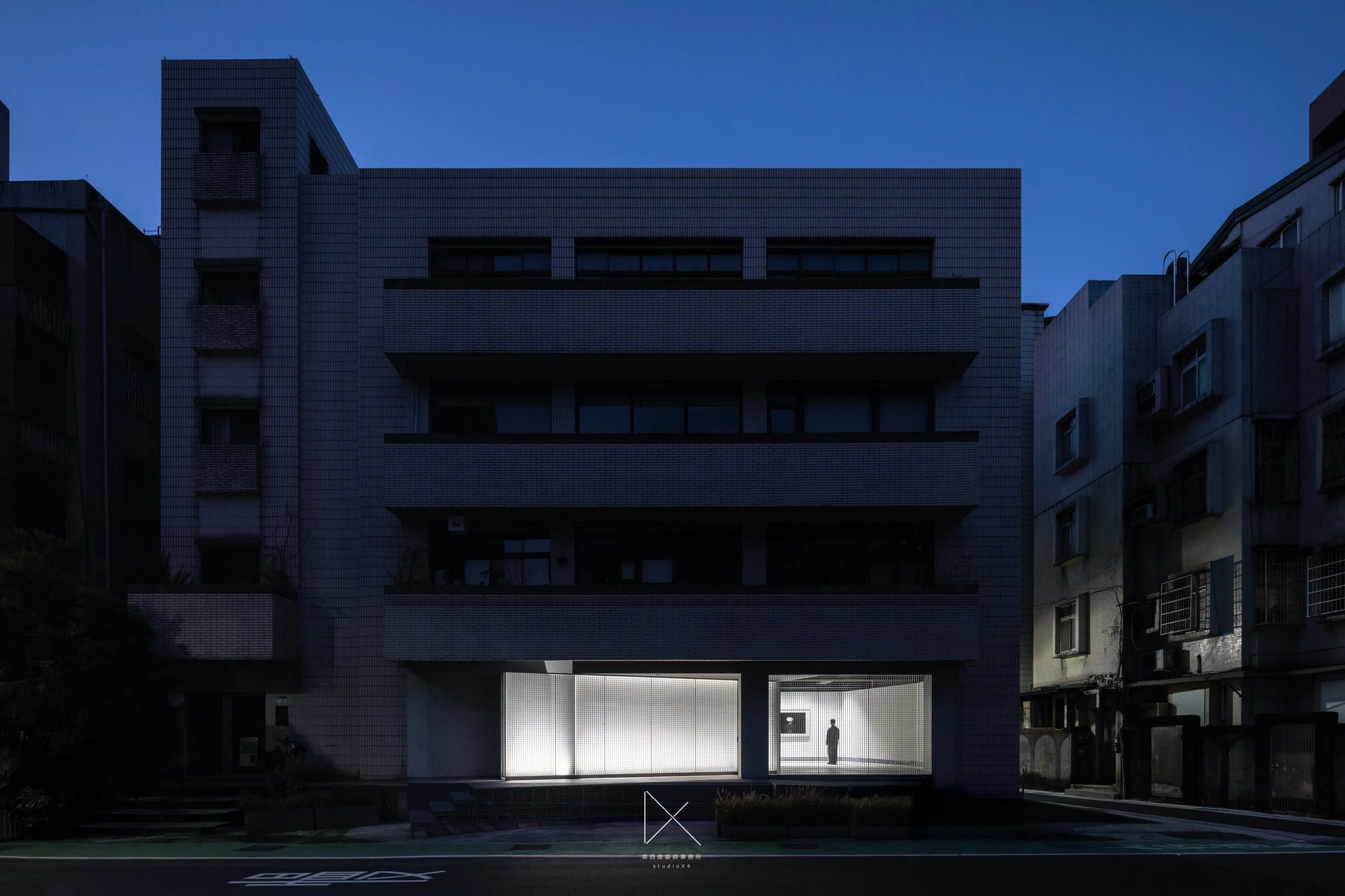 夜間建築正立面,一樓展間燈光點亮整棟量體,人影立於藝廊入口。