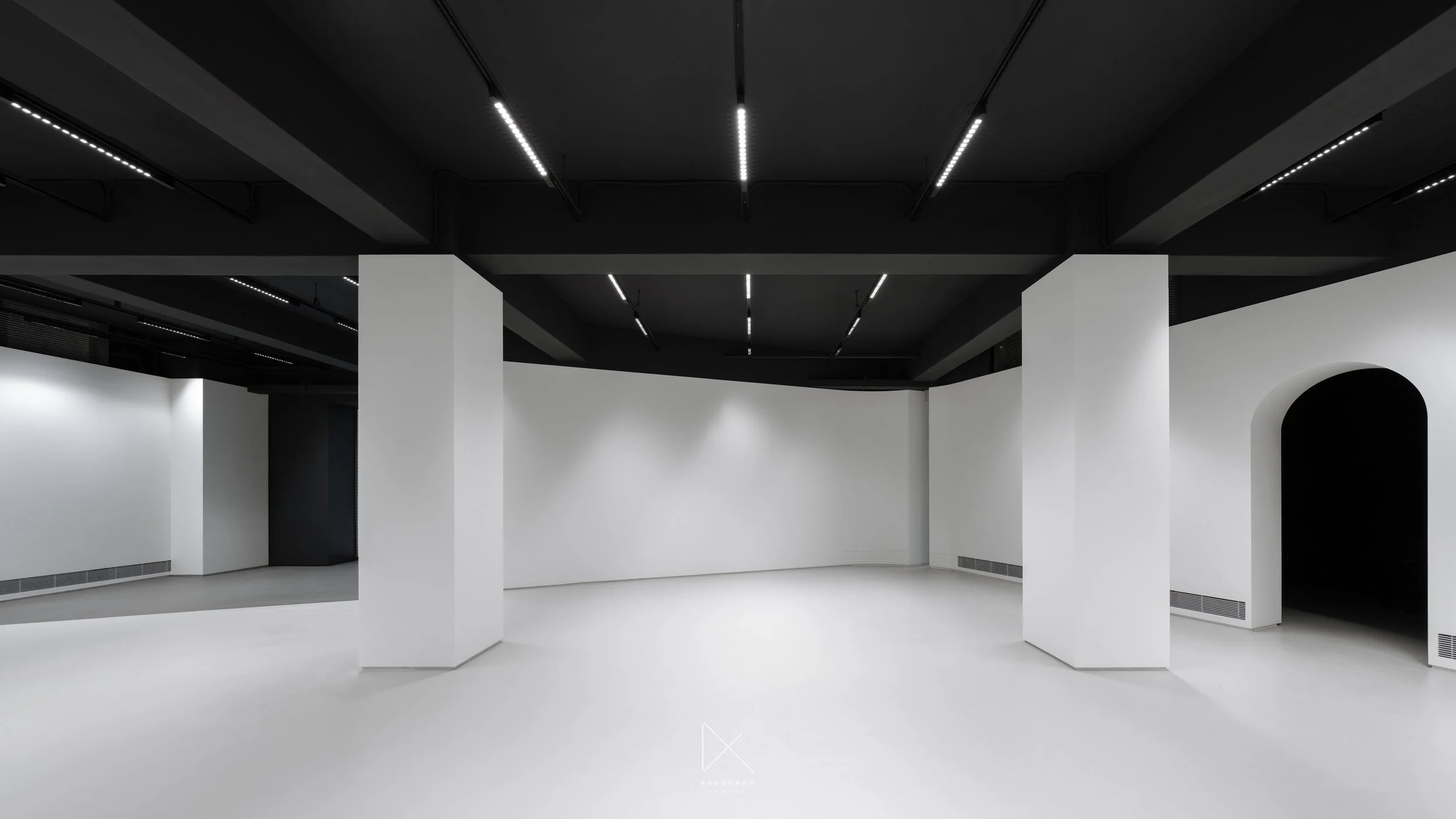 If the work is exuberant, the space must feel exuberant; if the work is bashful, the space must feel bashful. White walls, white floor, black ceiling, columns in series, and the grid's light drifting along the rear wall — we lowered our own voice so the work could speak.