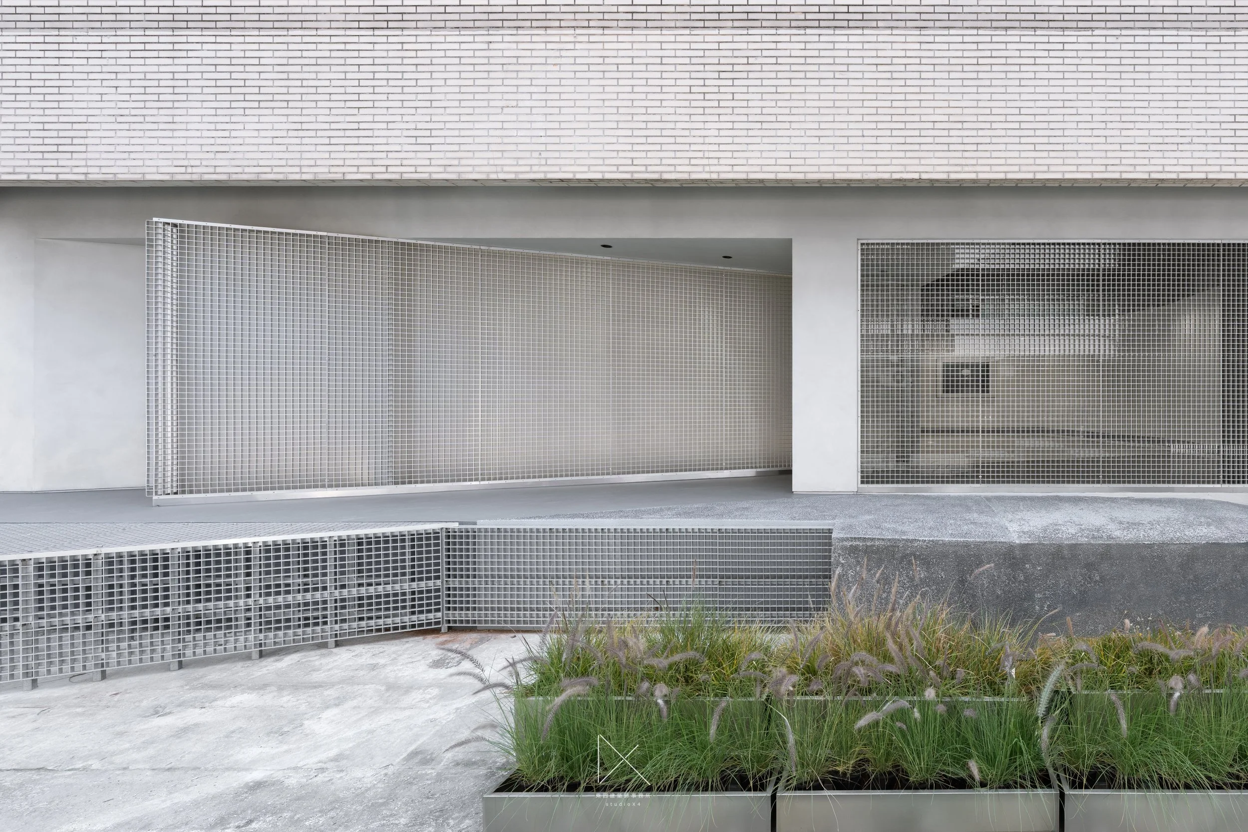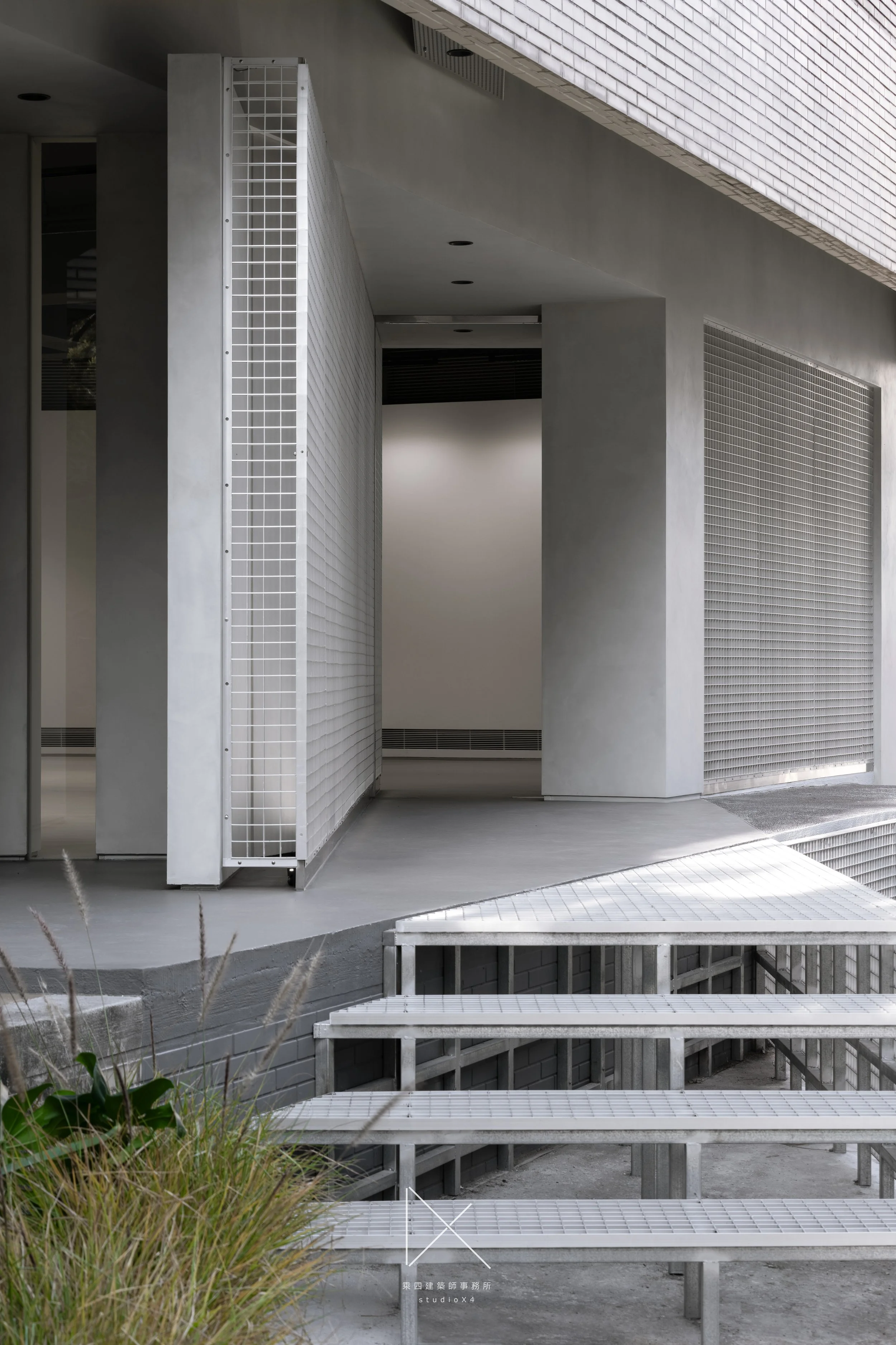 日間外觀,鋁格台階、植栽槽、抬高地板由前景向後延伸。
