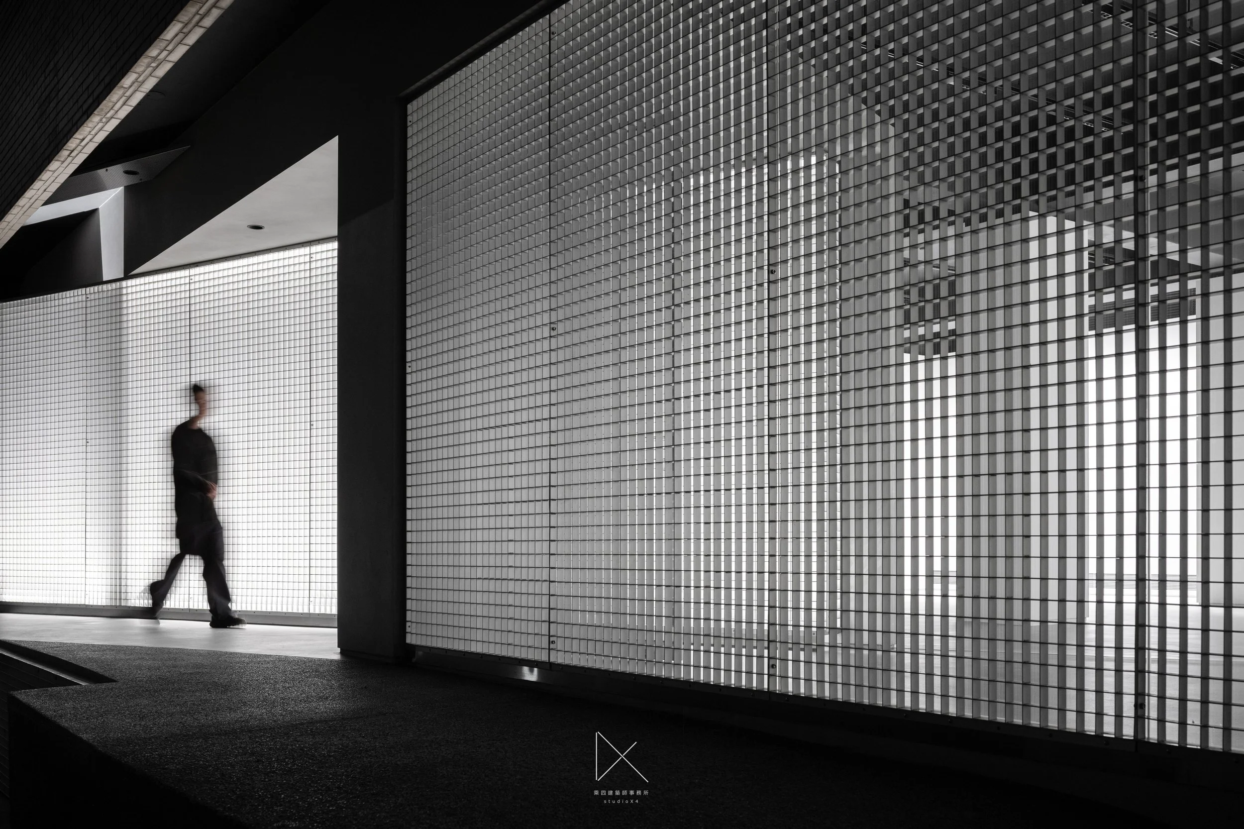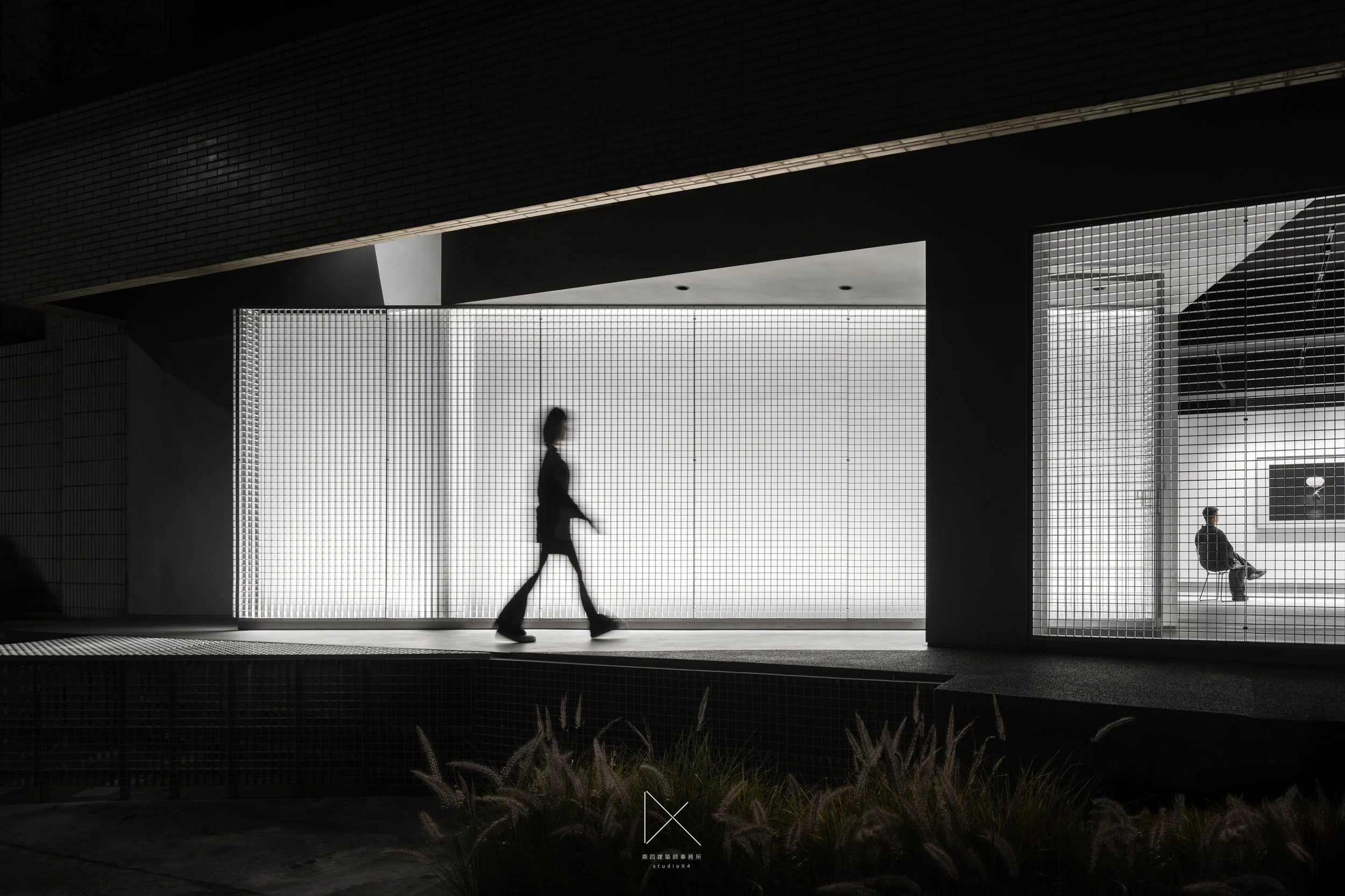 鋁格近景,黑白高反差,人影穿越方格光線。
