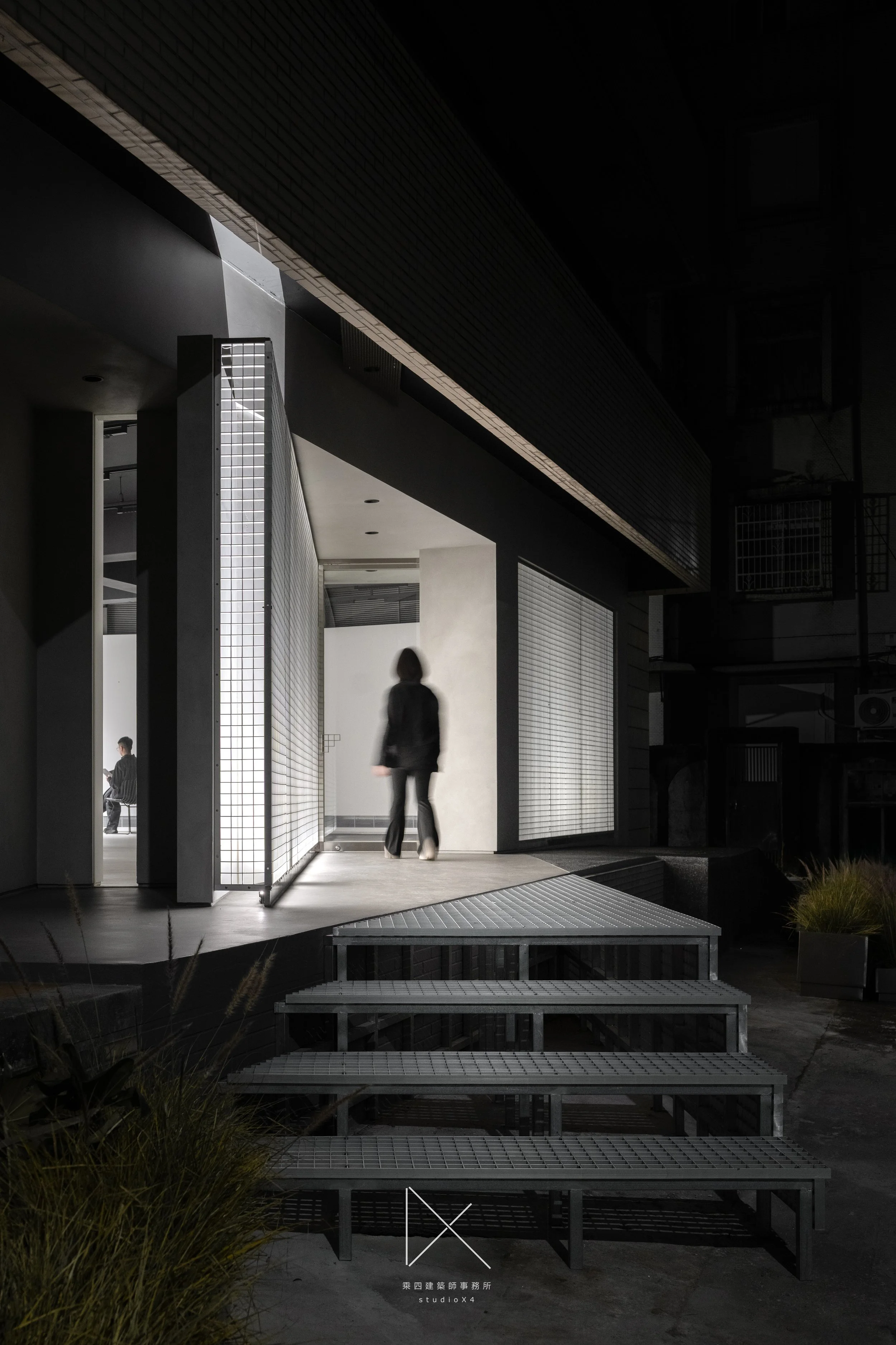 夜間入口斜角,人影正步入門洞,鋁格光幕作背景。