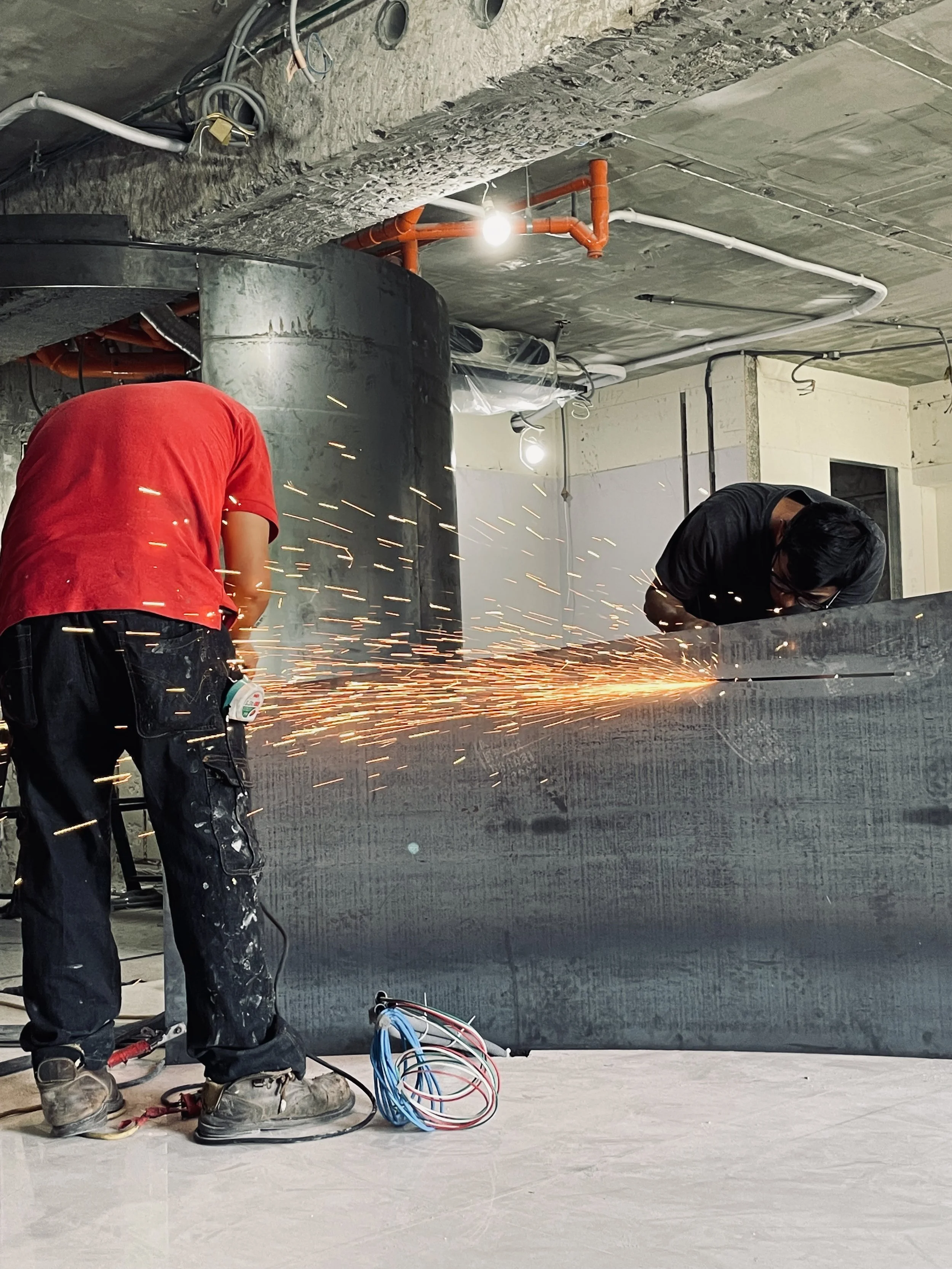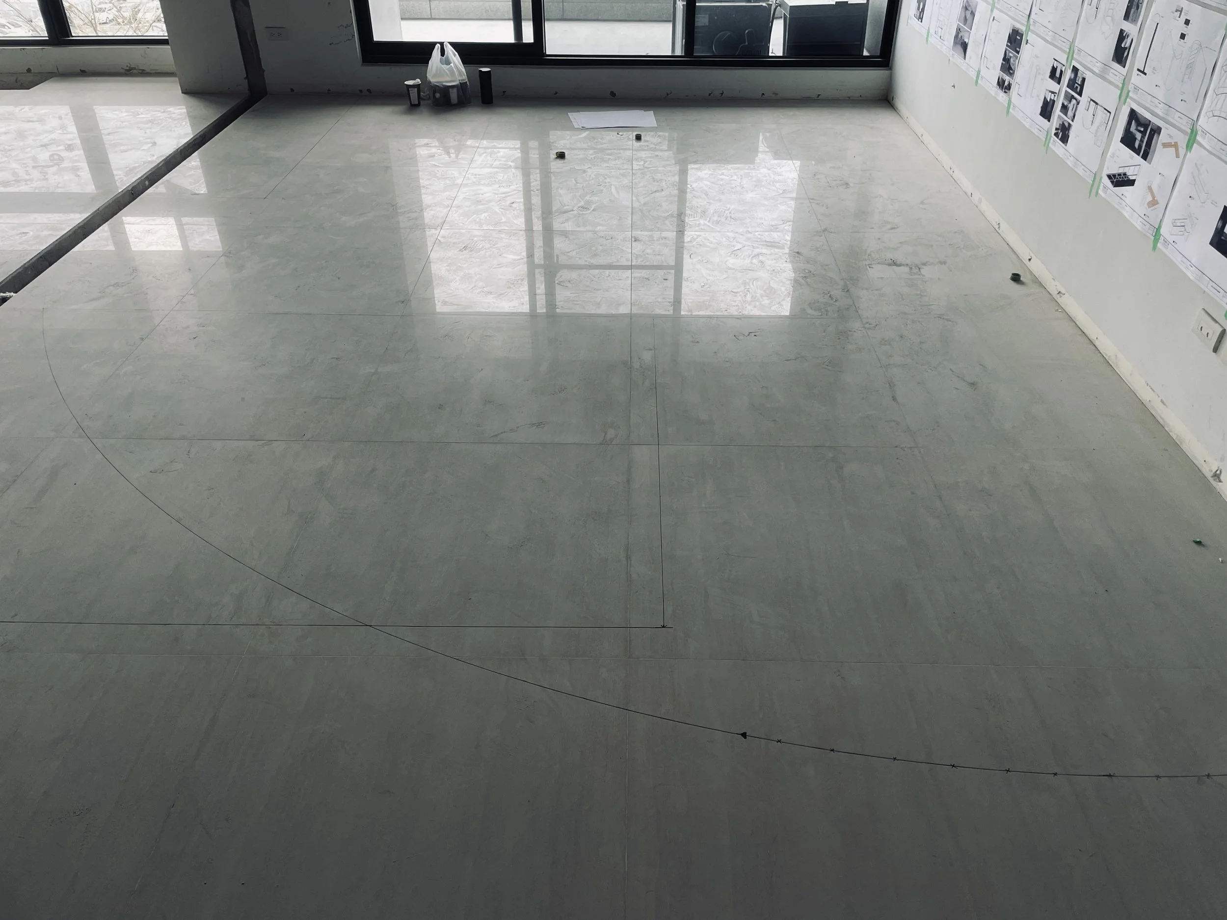 開工之前的放樣線(畫面中左方是300*150的桌子位置,弧線為工作區隔間)